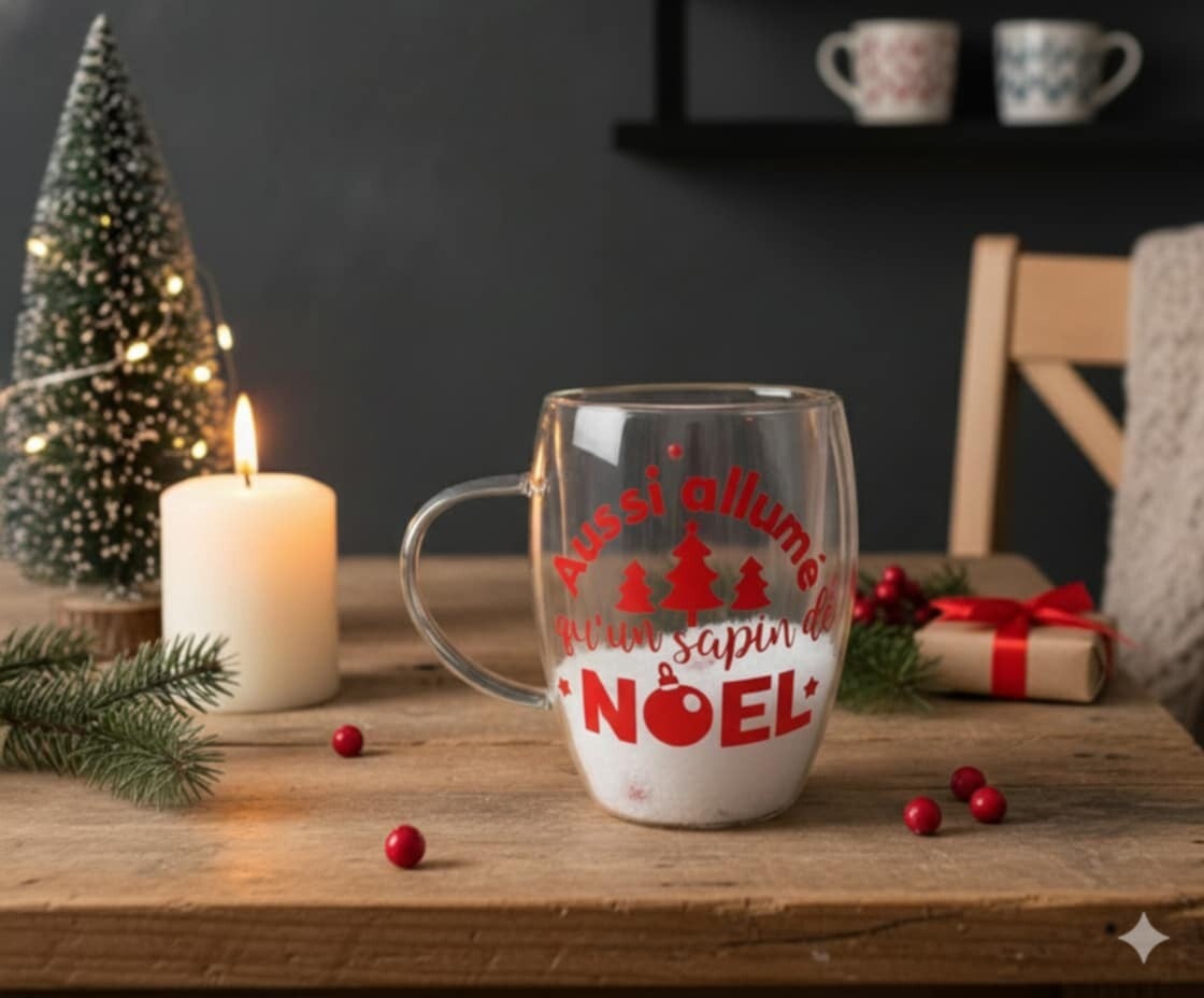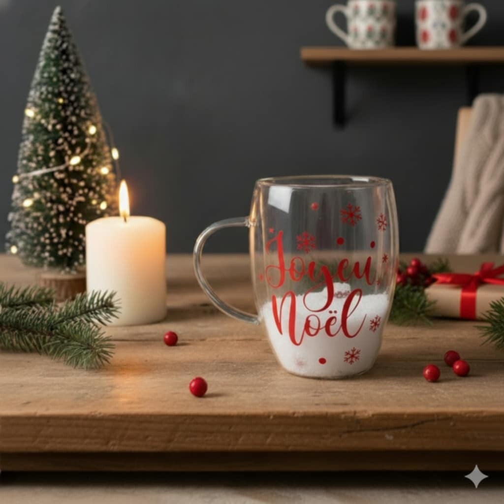 Plongez dans l’ambiance magique de Noël avec cette tasse en verre double paroi, décorée de flocons rouges en vinyle permanent. Son design raffiné et sa contenance idéale en font l’alliée parfaite de vos boissons chaudes, chocolats gourmands et instants cocooning.