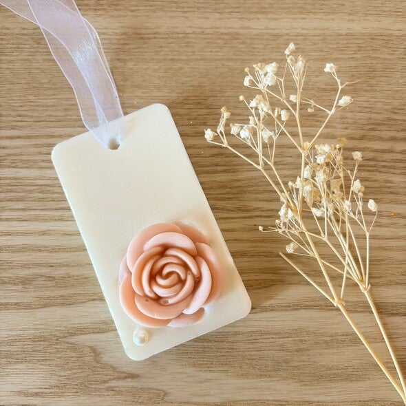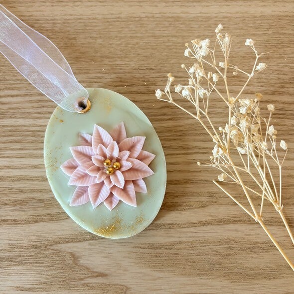 De délicates suspensions à accrocher dans une armoire, sur une poignée de commode ou simplement dans une pièce, pour diffuser subtilement un parfum naturel et apaisant. Chaque pièce est coulée à la main en cire de colza, ornée de fleurs sculptées et pensée comme une petite création poétique — à offrir ou à garder précieusement.