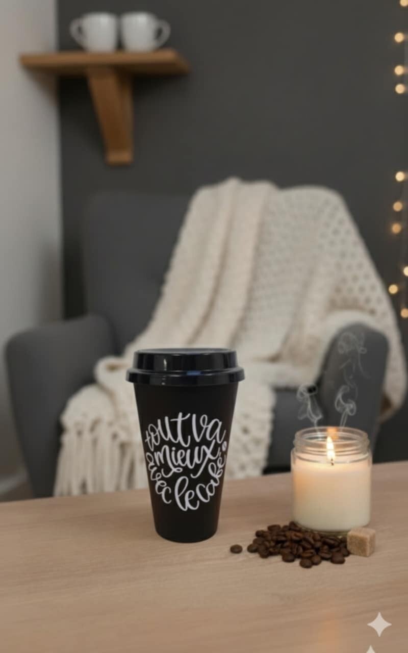Un gobelet nomade pour savourer chaque café avec conscience et élégance. Fabriqué en matériaux durables, il accompagne les matins pressés, les instants cocooning ou les balades hivernales. Chaque modèle est décoré d’un message doux, drôle ou inspirant, pour transformer chaque pause en moment à soi.