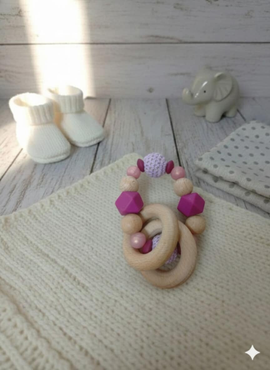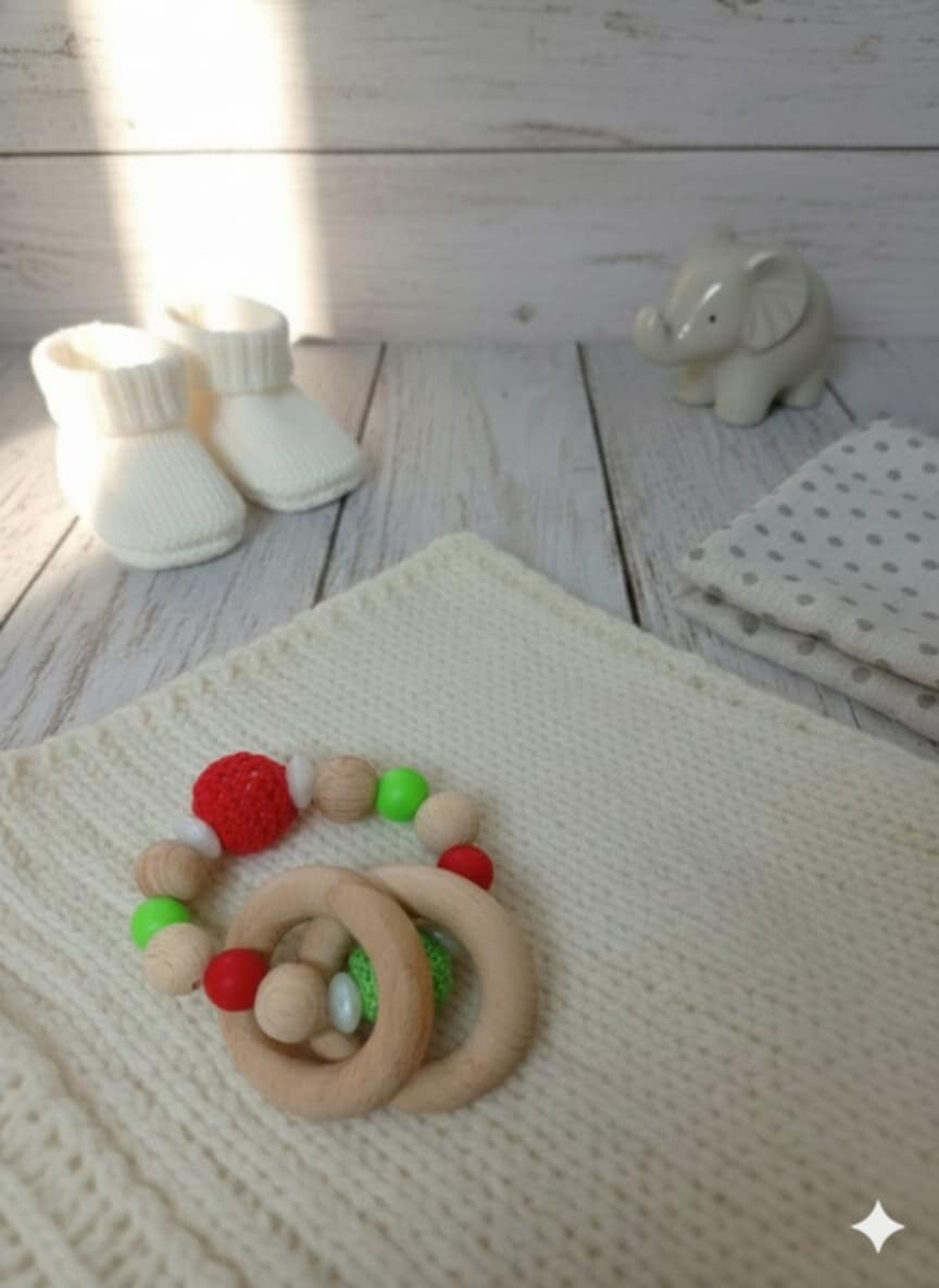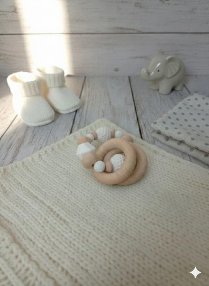 Un accessoire naturel et fait main, pensé pour accompagner bébé dans ses premières découvertes. Ce hochet associe bois brut et textures variées pour stimuler les sens tout en douceur.