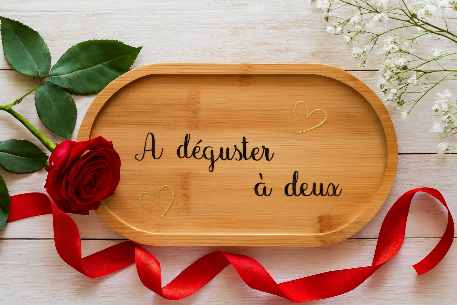Des planchettes en bois personnalisées pour accompagner les moments gourmands. Ce modèle affiche un message tendre appliqué directement sur le bois, pour une finition douce et chaleureuse. Idéale pour les apéros complices, les brunchs en duo ou les petites douceurs à partager, elle apporte une touche d’émotion à chaque dégustation.