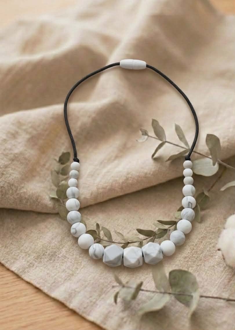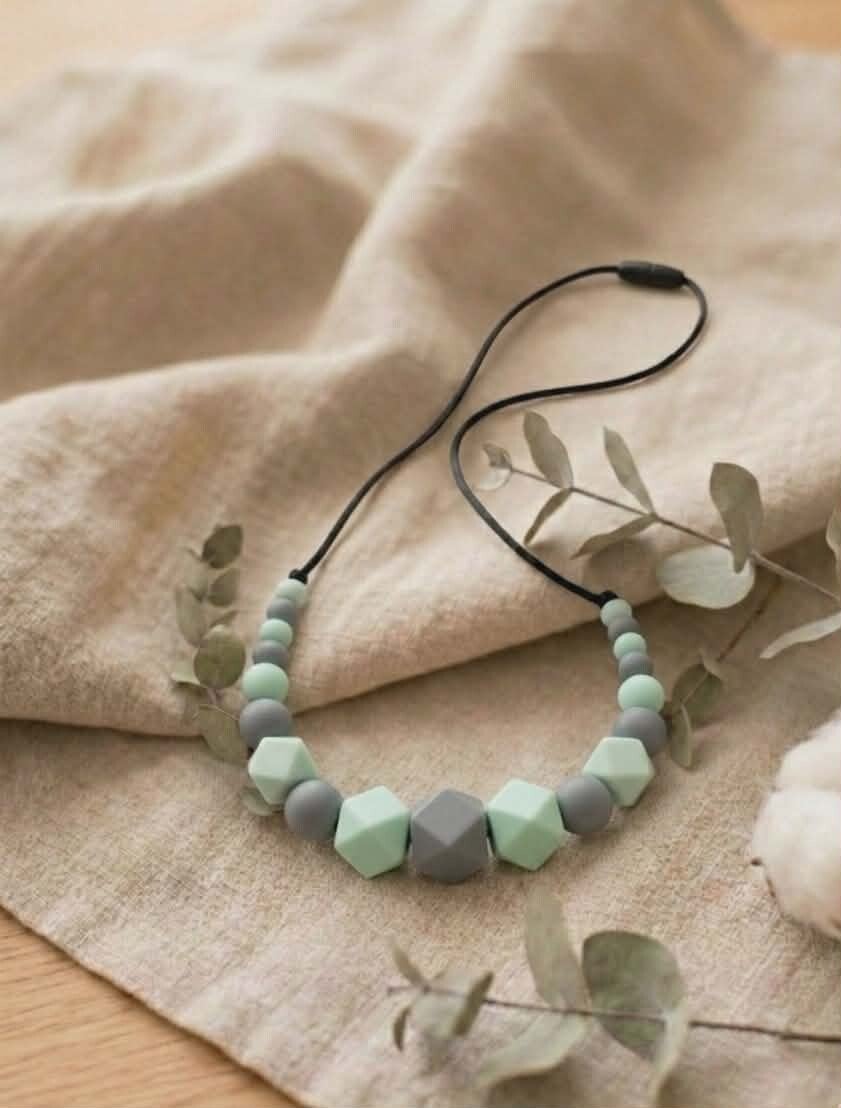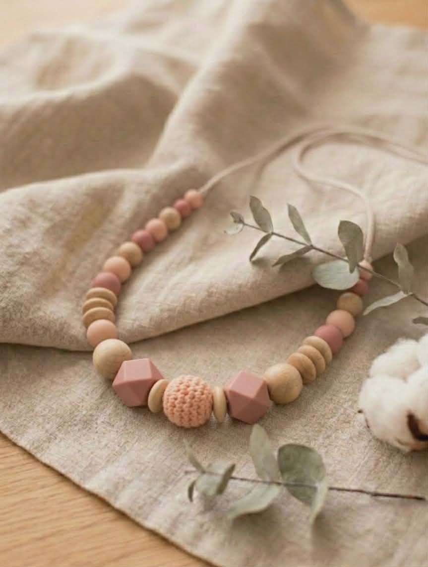 Le collier de portage est un bijou conçu pour être porté exclusivement par un adulte lors des moments avec bébé : portage, allaitement, biberon ou câlins. À la fois élégant pour la maman et sensoriel pour l'enfant, il permet d'occuper naturellement les petites mains curieuses tout en apportant une touche jolie à votre tenue.
